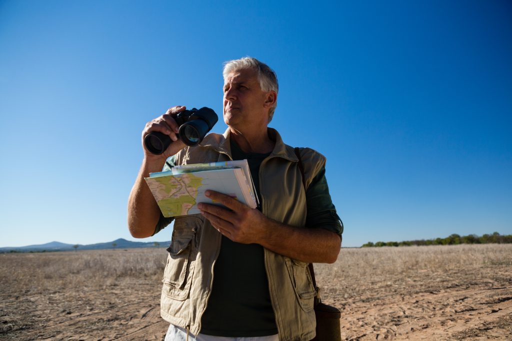 Man with binocular and map standing against blue sky on landscape